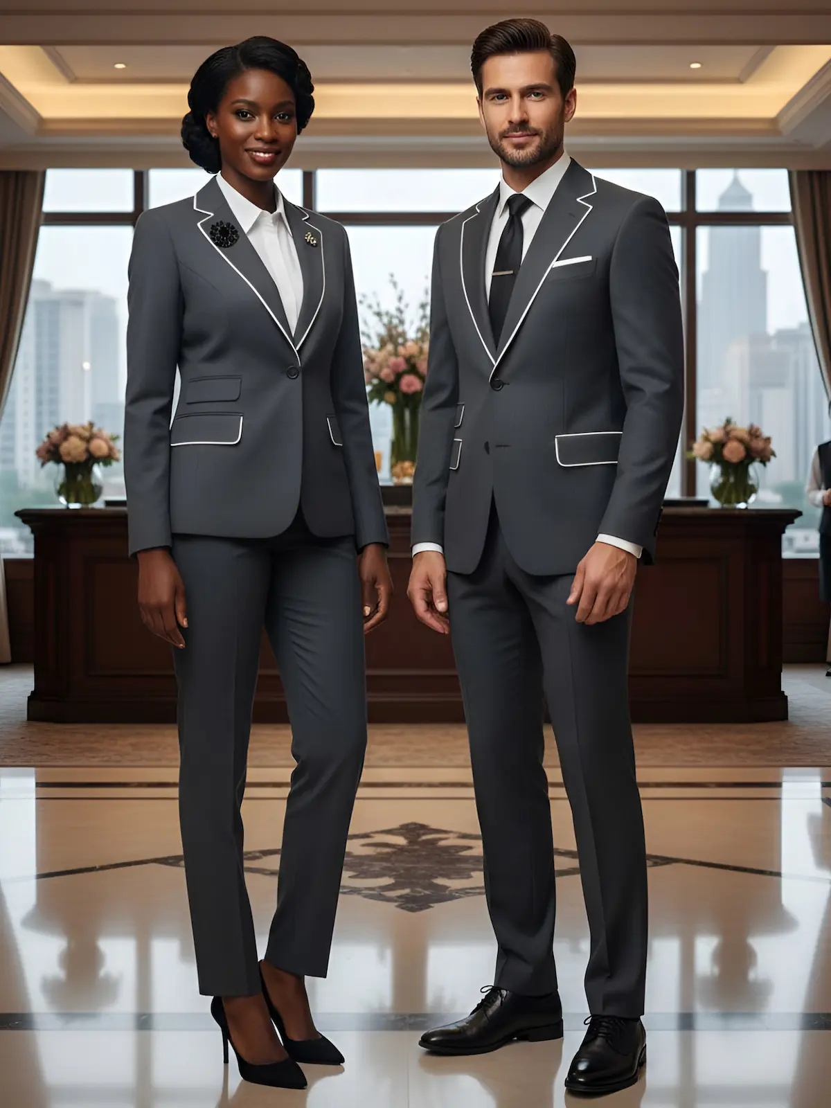Professional reception uniforms designed for front-desk and concierge teams, offering comfort, elegance, and durability. These garments ensure a polished appearance and support daily guest interactions, enhancing the overall reception experience with a refined, welcoming presentation.