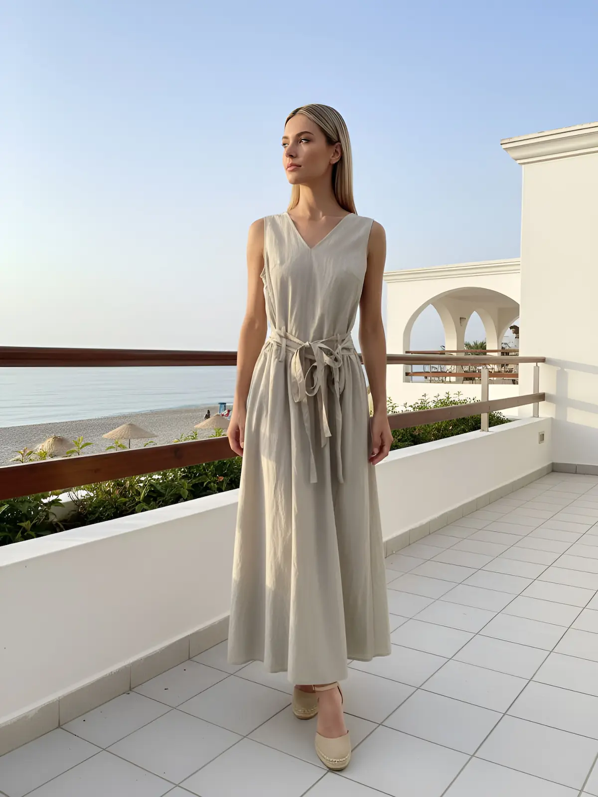 A lightweight, sleeveless summer dress designed for effortless elegance in warm-weather environments. Featuring a soft V-neckline, adjustable waist ties for a flattering fit, and an airy, flowing silhouette ideal for beach bars, resorts, and outdoor hospitality settings.