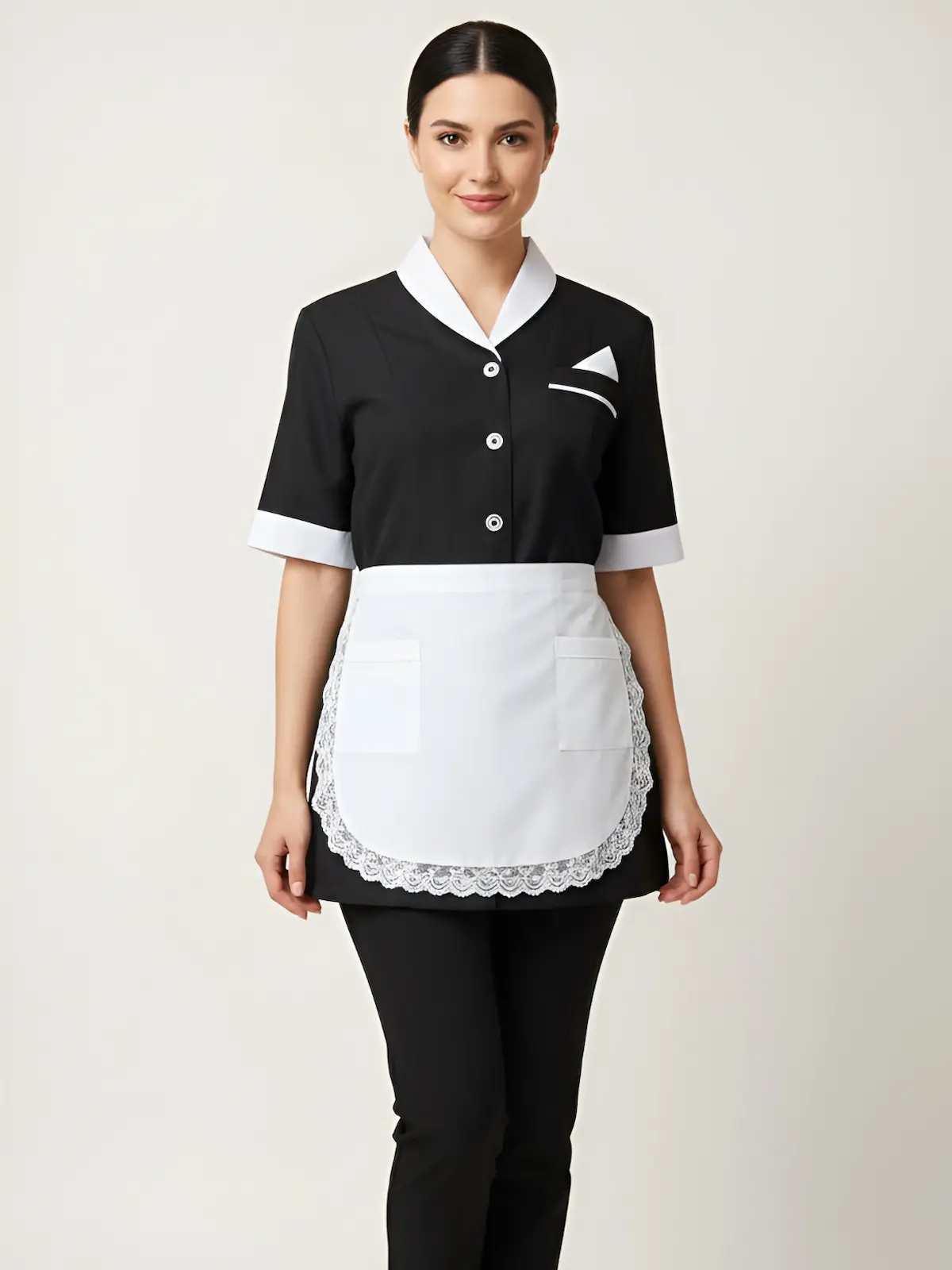 Professional housekeeping set with top, pants, and apron. Designed for functionality and a refined appearance.