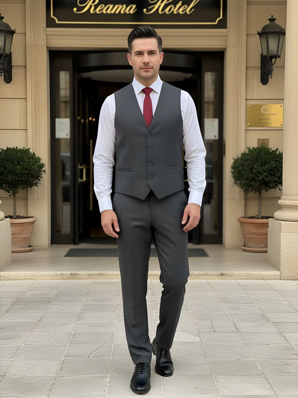 Classic men’s uniform featuring a tailored grey waistcoat and matching trousers, paired with a crisp white shirt and red tie for a refined, professional look.
