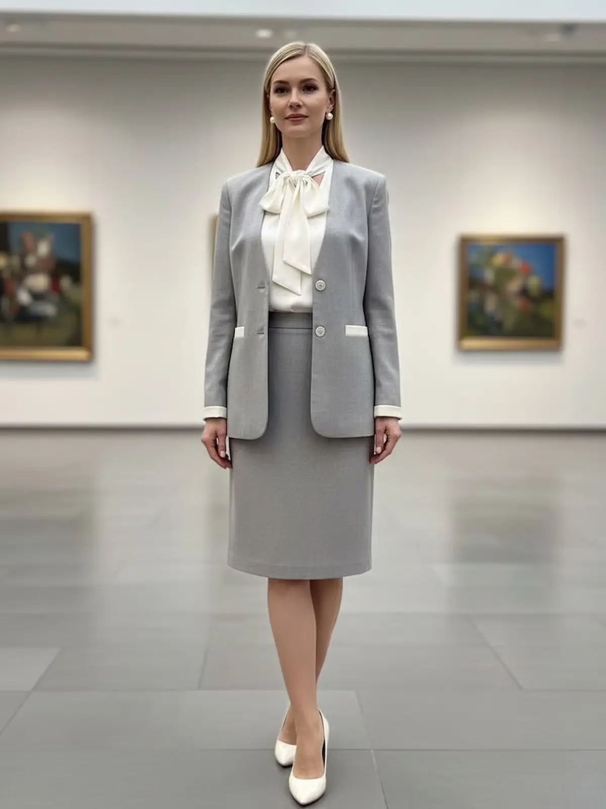 Paired with an ivory bow-tie blouse, delivering a refined and professional appearance.