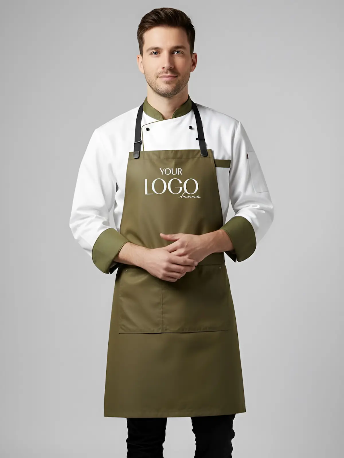 Bib apron in olive green. It features an adjustable neck strap and a large front pocket for practicality. Made from highly durable fabric, ideal for professionals in food service, bars, or kitchen crews.
