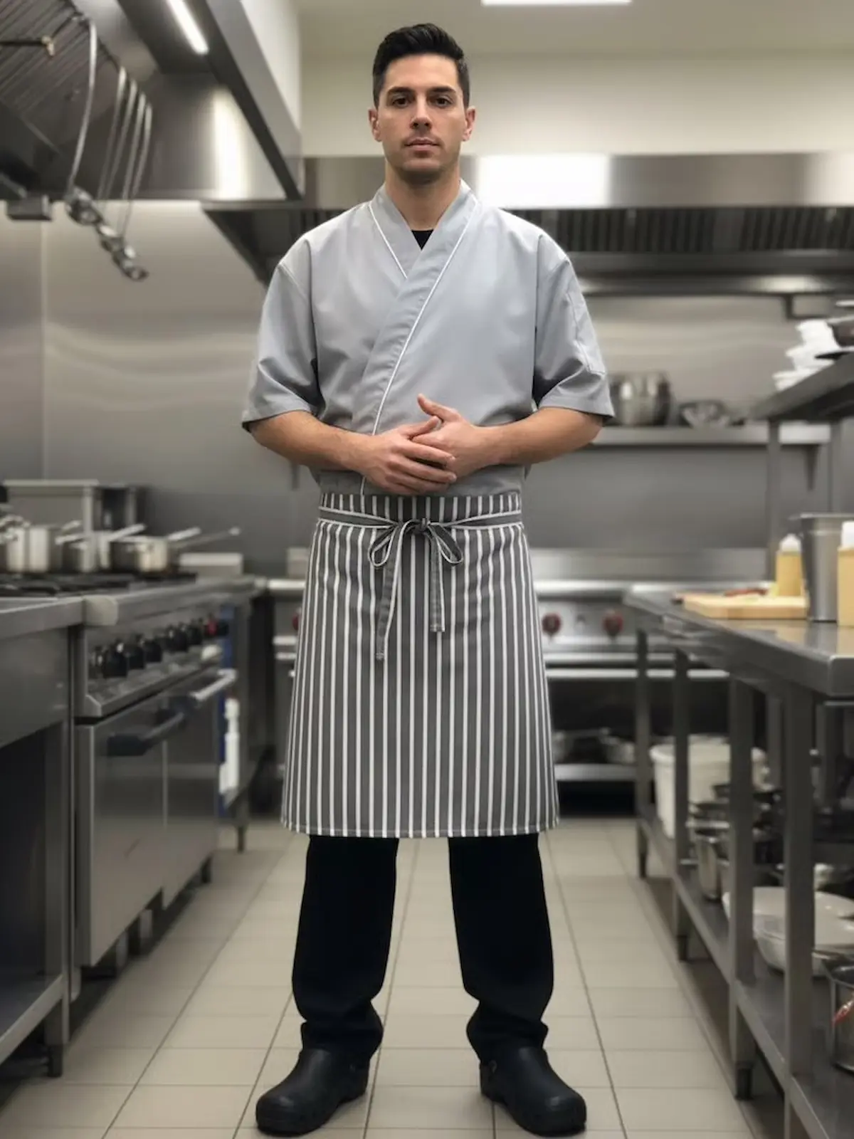 Professional chef uniform in industrial grey tones. Cross-wrap chef jacket paired with striped waist apron and black performance trousers. Minimal and functional design for high efficiency in the kitchen.