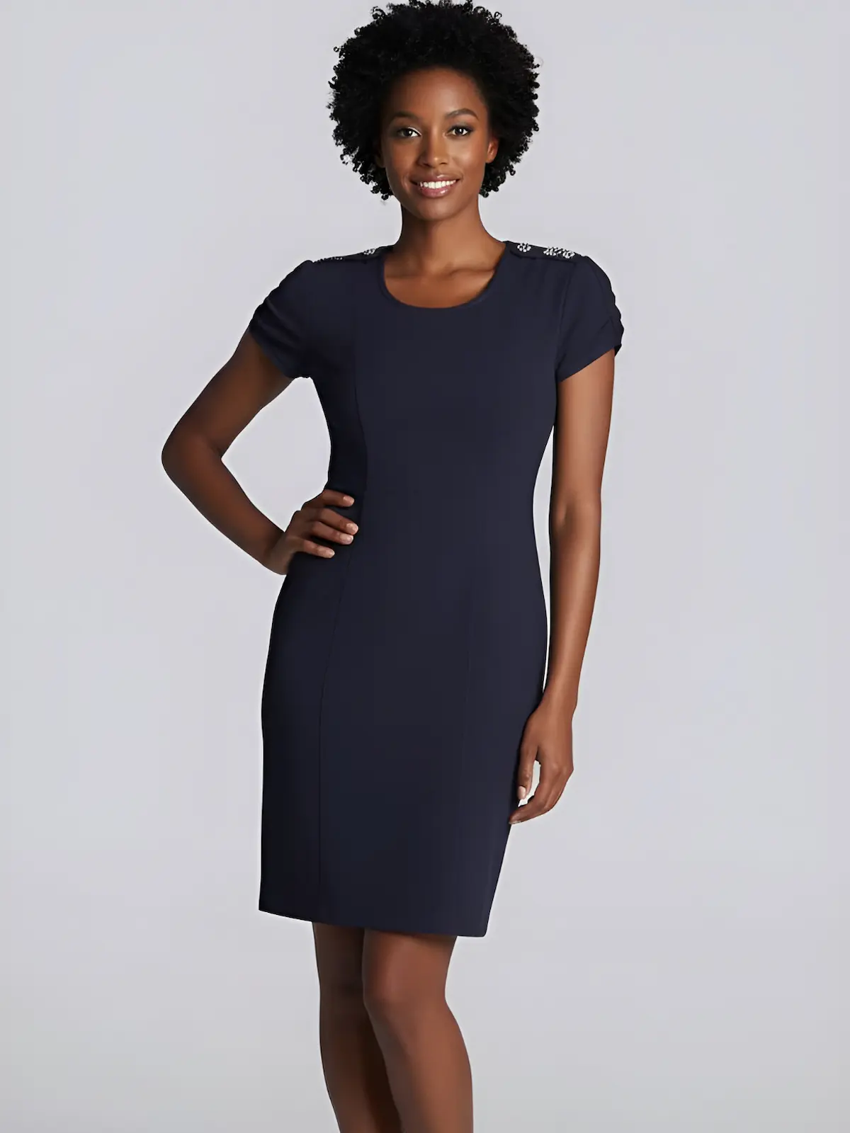 Elegant navy blue dress with a tailored fit and subtle shoulder details. Crafted from a soft, stretchy fabric blend that provides comfort and sophistication — ideal for yacht service or resort hospitality.